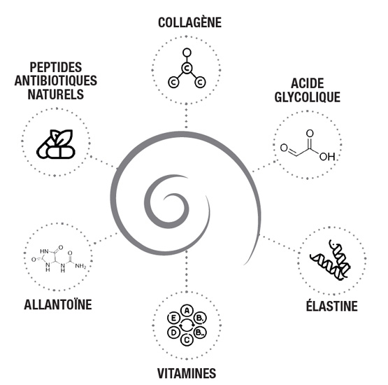 Voici en détail ce que contient naturellement la bave d’escargot, et comment chacun de ces actifs agit sur la peau :